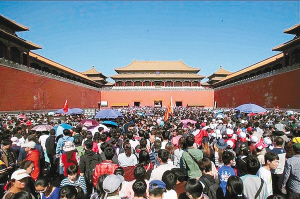 故宫,三大殿挤得看不到地面:售票窗口前排着蜿蜒的长队,三大殿所在的故宫中轴线上,游客多得看不到地面。